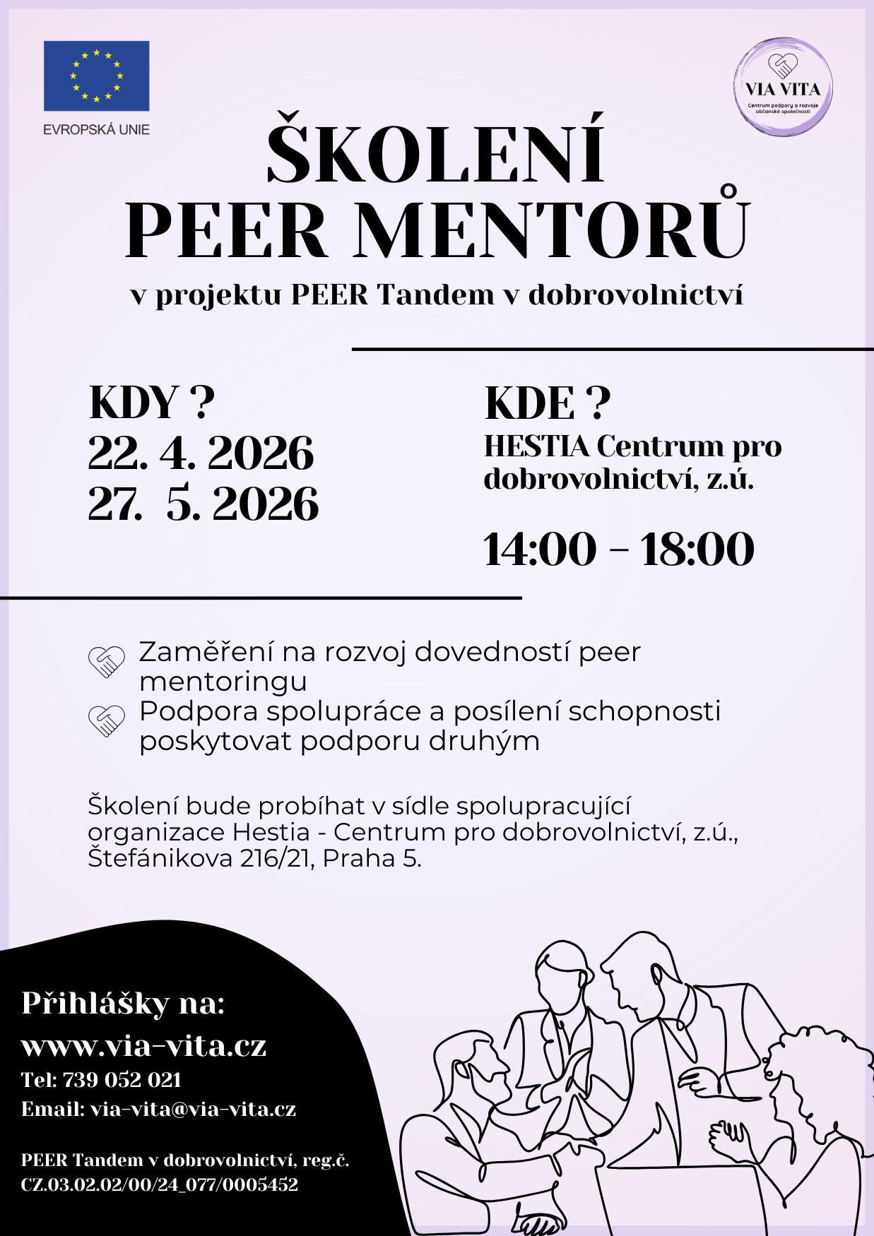 Školení realizujeme v rámci projektu Peer Tandem. Je určeno všem, kteří chtějí působit jako peer dobrovolníci nebo mentoři a podpořit druhé na základě vlastní zkušenosti.